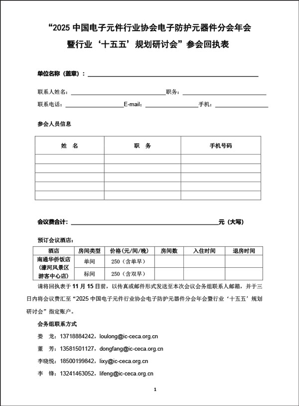 “2025中國電子元件行業(yè)協(xié)會(huì )電子防護元器件分會(huì )年會(huì )“參會(huì )回執表